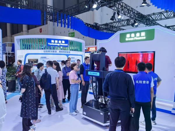 中国太保展厅以小篆的“水”字为设计原点,整体布局形似“川”字,寓意本次展会的举办地四川,展厅展示以“五篇大文章”为主线,全面介绍了中国太保在科技金融、绿色金融、普惠金融、养老金融和数字金融方面的丰硕成果,让无形的保险服务变得“有形可感”。